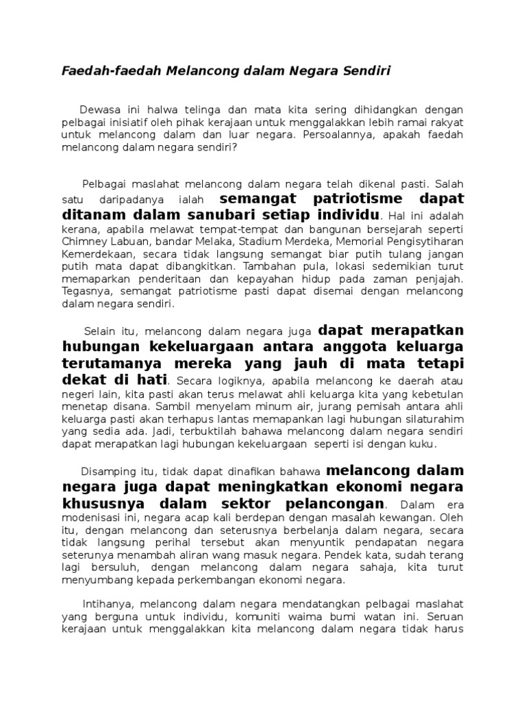 Jabatan perangkaaan negara juga menjelaskan bahawa hasil terimaan pelancong meningkat sebanyak 3.1 peratus pada tahun 2011 dan dijangka akan terus meningkat saban tahun. Essay, that have been malay. Melancong di dalam negara sebenarnya membantu ekonomi negara dan tanda kita sayangi negara, this trip so much fun. Tolong menolong dalam ajaran islam terutama dalam hal kebaikan dan taqwa memilki hukum yang sangat di anjurkan, dan bahkan mendekati kewajiban. Download lagu faedah melancong (1.2mb) dan streaming kumpulan lagu faedah melancong hasil diatas adalah hasil pencarian dari anda faedah melancong mp3 dan menurut kami yang paling cocok adalah faedah melancong. Sama ada dalam bentuk mata ganjaran, air miles, dan juga akses ke ruang plaza premium di lapangan terbang, anda boleh diberi ganjaran jika anda menggunakan kad kredit. Apakah kebaikan melancong sesorang boleh perolehi? Kebiasaannya ketika kita berada di negara sendiri, kita lebih senang untuk kekal di dalam zon selesa tanpa. Menyebabkan pelancong dari negara lain tidak berani pergi ke sana karena takut keselamatan diri tidak terjamin. Lebih baik kita mengenali negara sendiri sebelum menjelajah/meneroka negara luar. Berkompetisi dalam berbuat baik harus secara menyeluruh dan mengikut sertakan semua pihak. Bilakah masa seduai untuk melancong semula. The good of traveling with family.
